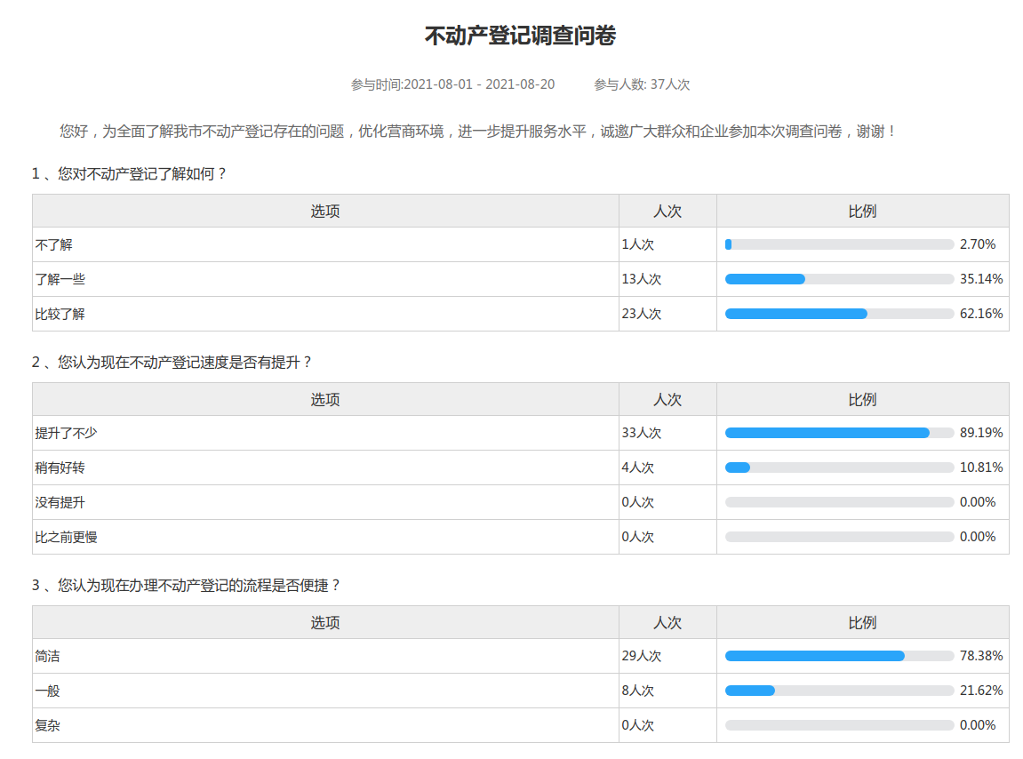 您好,为全面了解我市不动产登记存在的问题,优化营商环境,进一步提升服务水平,诚邀广大群众和企业参加本次调查问卷,谢谢!