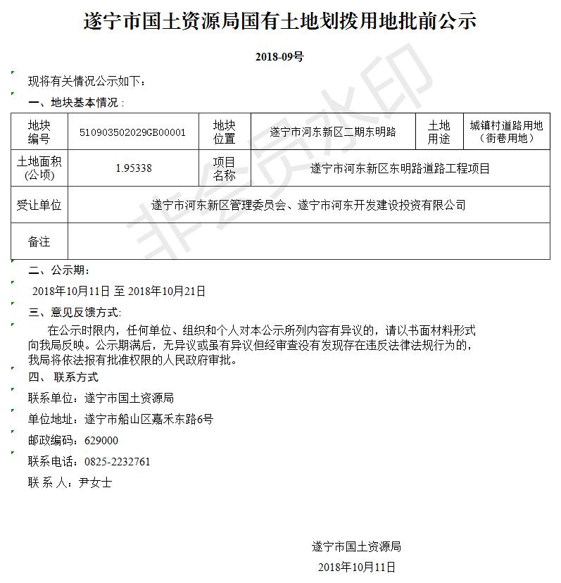 遂宁市国土资源局国有土地划拨用地批前公示(2018-09号)