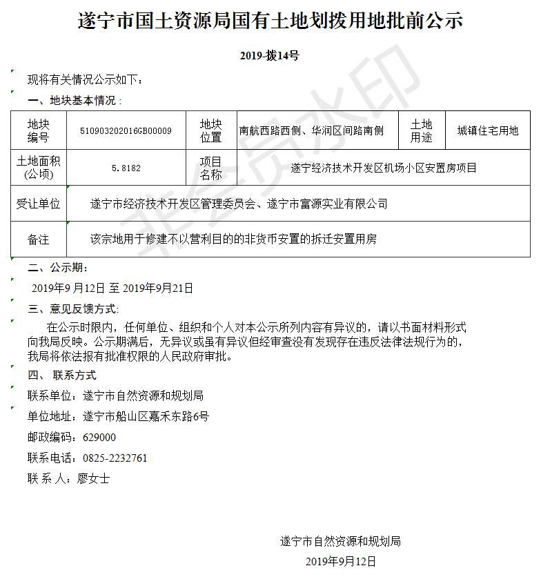 遂宁市国土资源局国有土地划拨用地批前公示(2019-拨14号)
