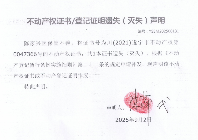 不动产权证书/登记证明遗失(灭失)声明(陈家兴)