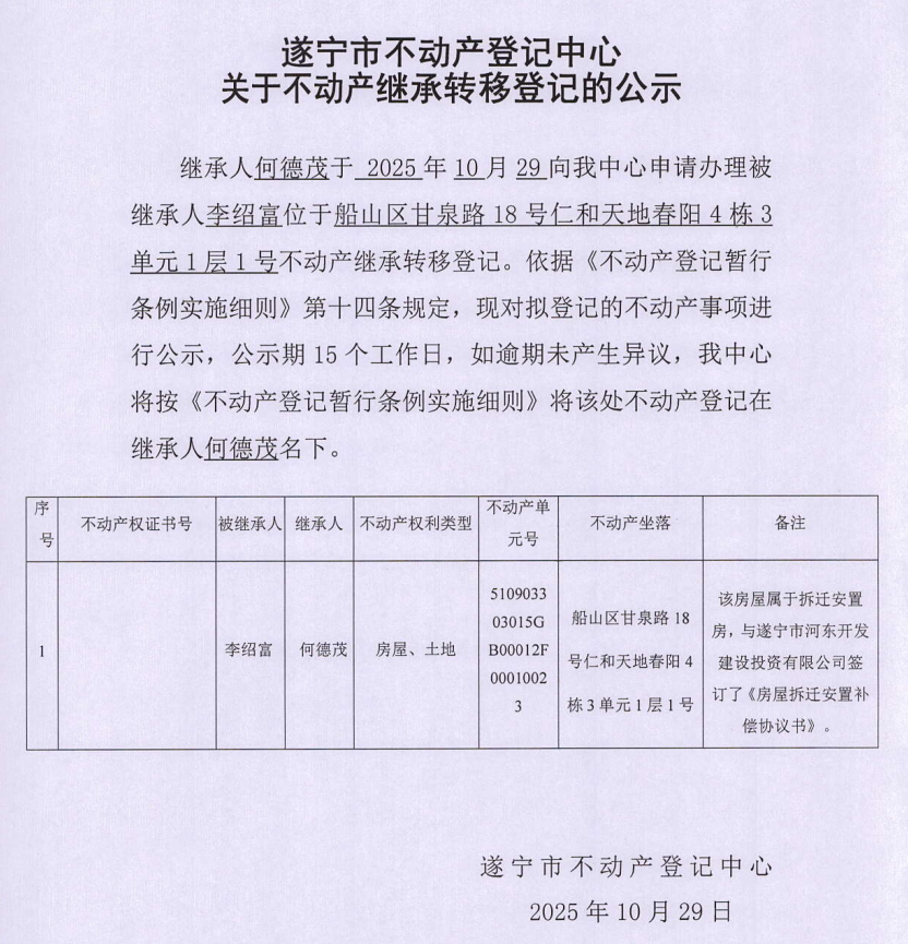 遂宁市不动产登记中心关于不动产继承转移登记的公示(何德茂)