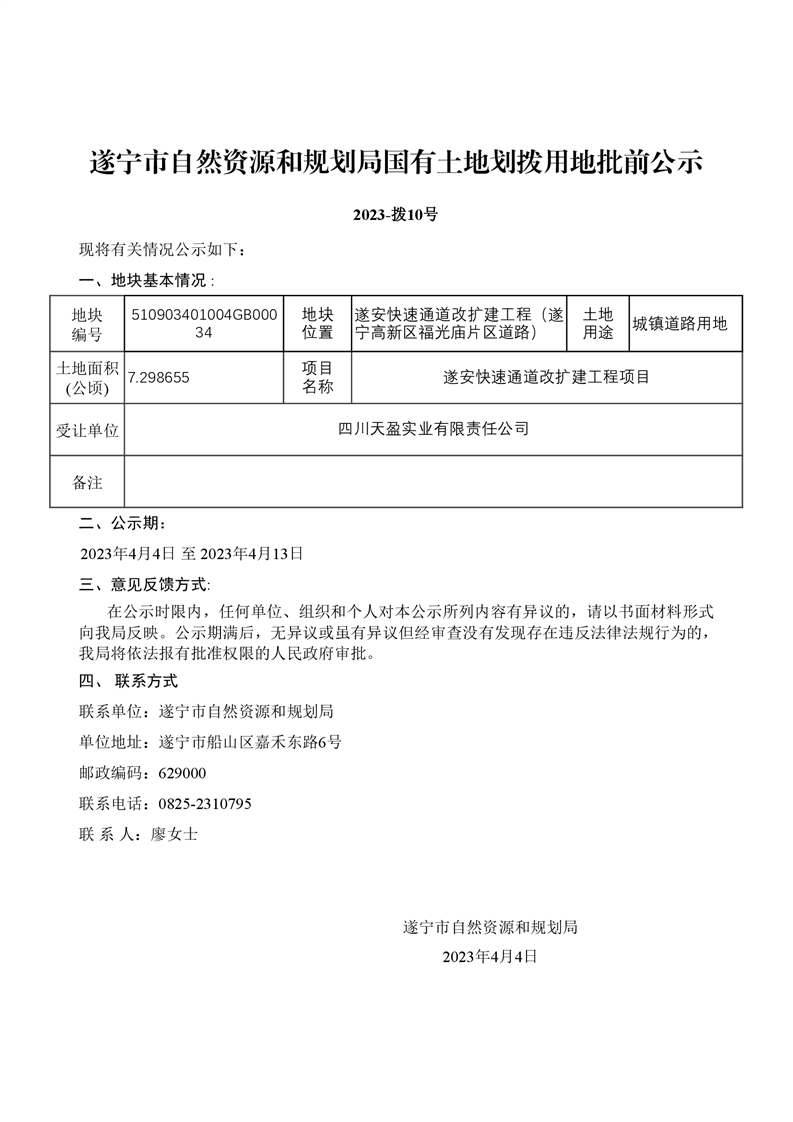 遂宁市自然资源和规划局国有土地划拨用地批前公示(2023-拨10号)