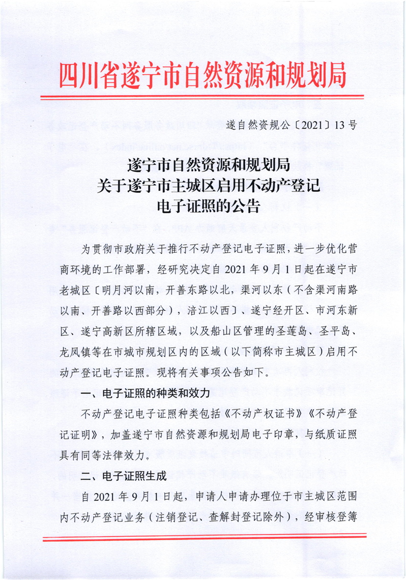 关于遂宁市主城区启用不动产登记电子证照的公告