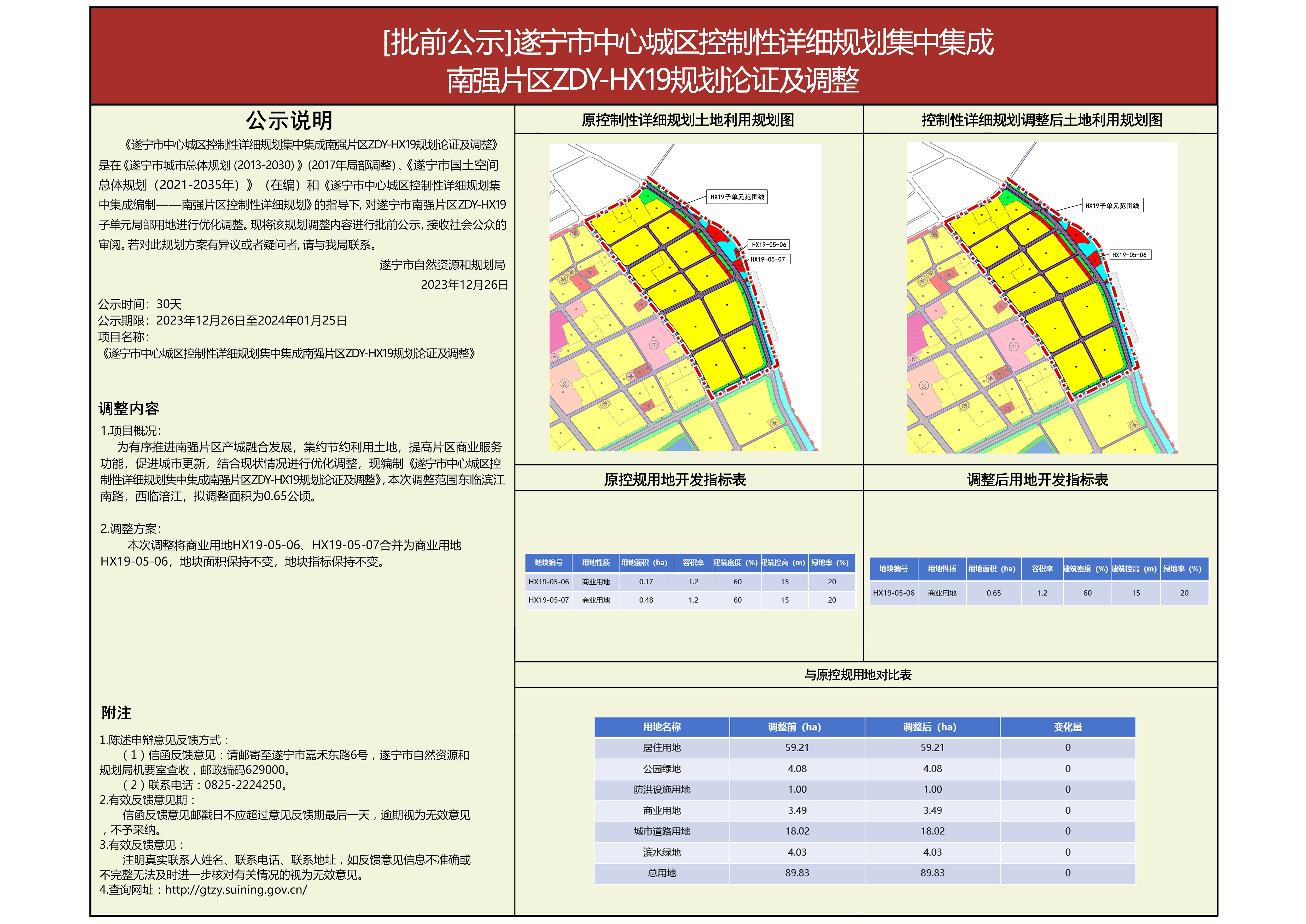 《遂宁市中心城区控制性详细规划集中集成南强片区ZDY-HX19规划论证及调整》是在《遂宁市城市总体规划(2013-2030)》(2017年局部调整)、《遂宁市国土空间总体规划(2021-2035年)》(在编)和《遂宁市中心城区控制性详细规划集中集成编制一一南强片区控制性详细规划》的指导下,对遂宁市南强片区ZDY-HX19子单元局部用地进行优化调整。现将该规划调整内容进行批前公示,接受社会公众的审阅。若对此规划方案有异议或者疑问者,请与我局联系。