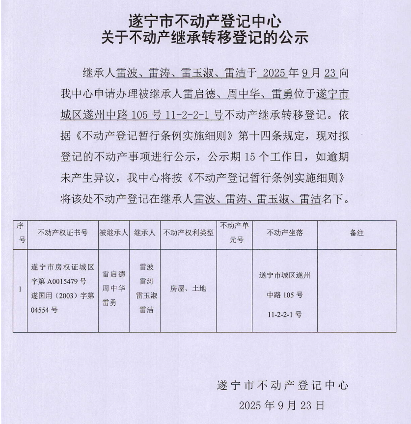 遂宁市不动产登记中心关于不动产继承转移登记的公示(雷波、雷涛、雷玉淑、雷洁)