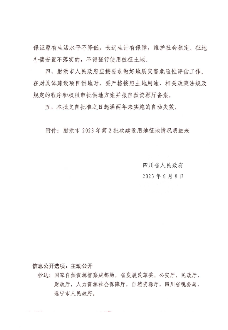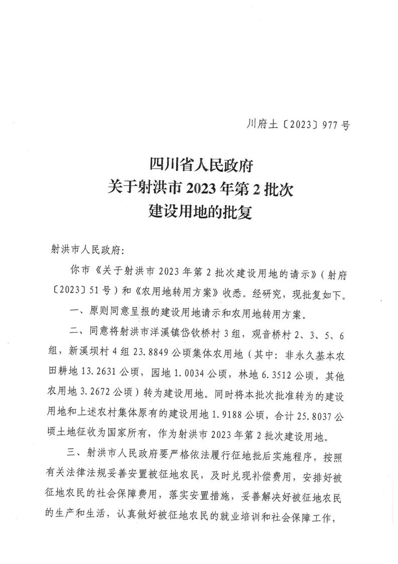 四川省人民政府关于射洪市2023年第2批次建设用地的批复(川府土〔2023〕977号 )