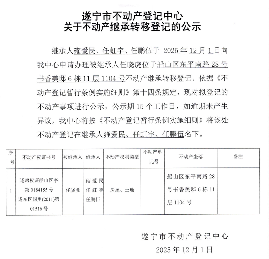 遂宁市不动产登记中心关于不动产继承转移登记的公示(雍爱民、任虹宇、任鹏伍)