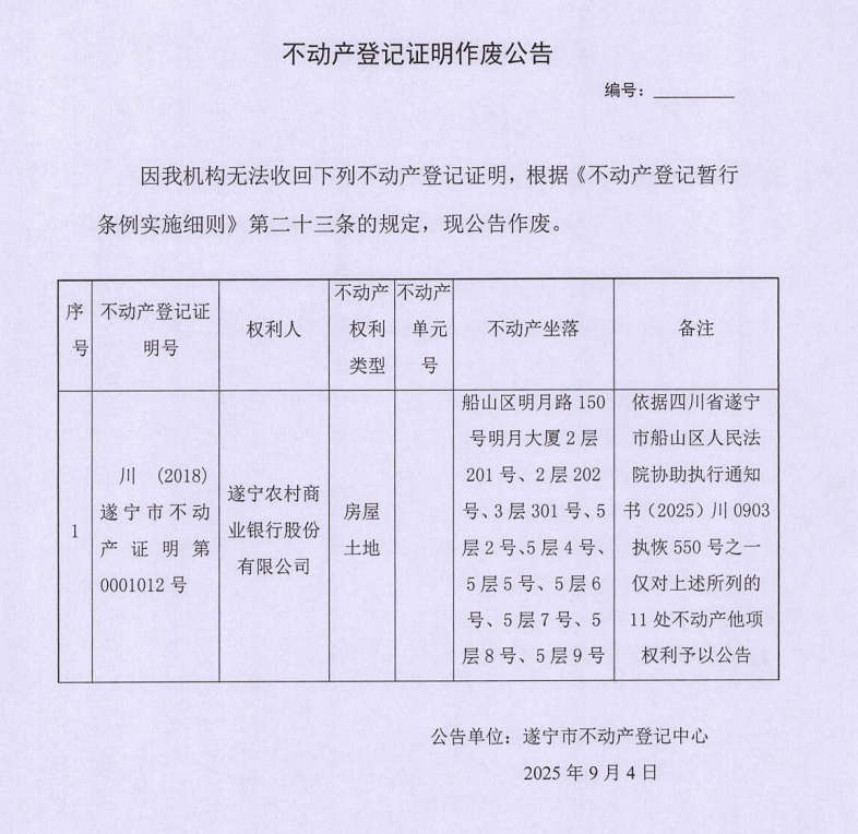 不动产登记证明作废公告(遂宁农村商业银行股份有限公司)