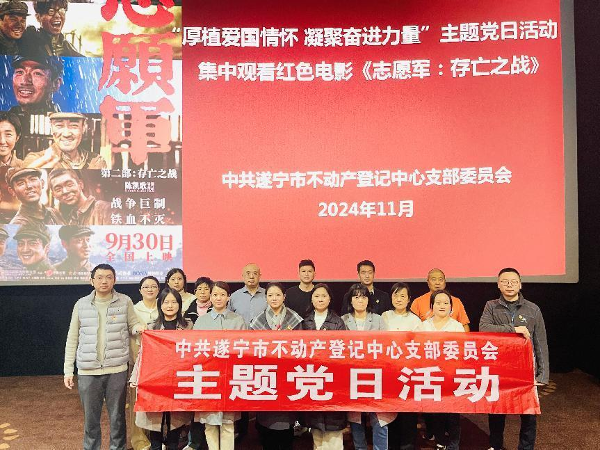 为深入贯彻落实党的二十届三中全会、省委十二届六次全会和市委八届十次全会精神,弘扬伟大抗美援朝精神,厚植党员爱党爱国热情,市不动产登记中心党支部开展“厚植爱国情怀 凝聚奋进力量”主题党日活动,组织党员集体观看红色电影《志愿军:存亡之战》。
