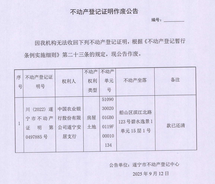 不动产登记证明作废公告(中国农业银行股份有限公司遂宁安居支行)