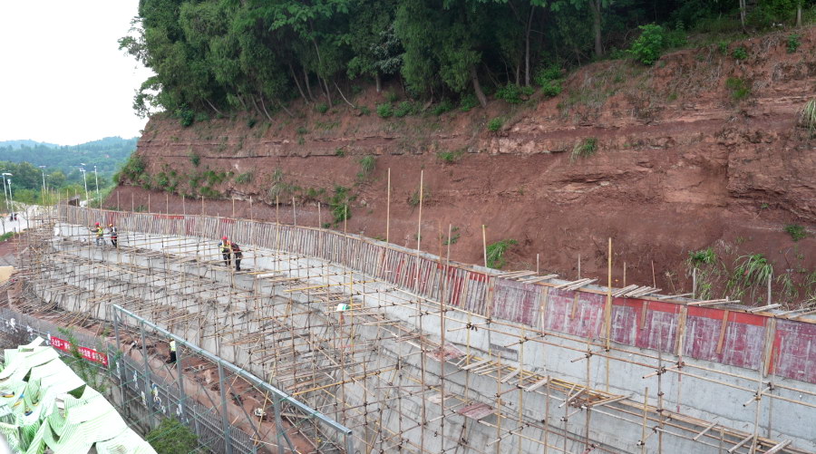 蓬溪县明月镇学校后山崩塌治理工程是我市被纳入民生实事的地质灾害隐患点治理项目之一。在施工现场,10余名工人正有条不紊地搬运钢筋、铺设护面板,各项作业有序推进。