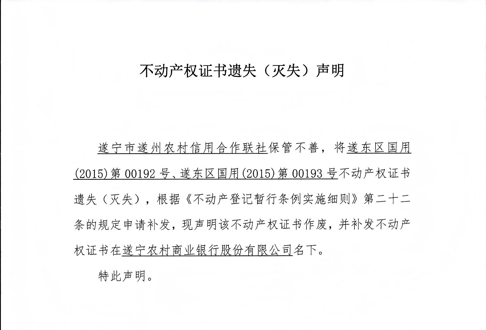 不动产权证书遗失(灭失)声明(遂宁农村商业银行股份有限公司)