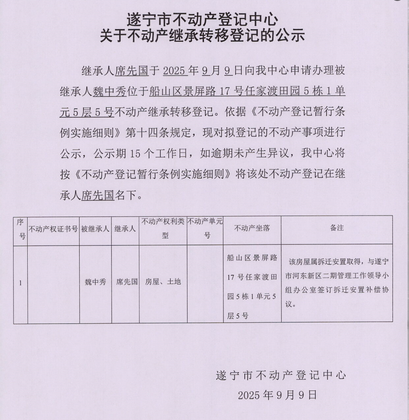 遂宁市不动产登记中心关于不动产继承转移登记的公示(席先国)