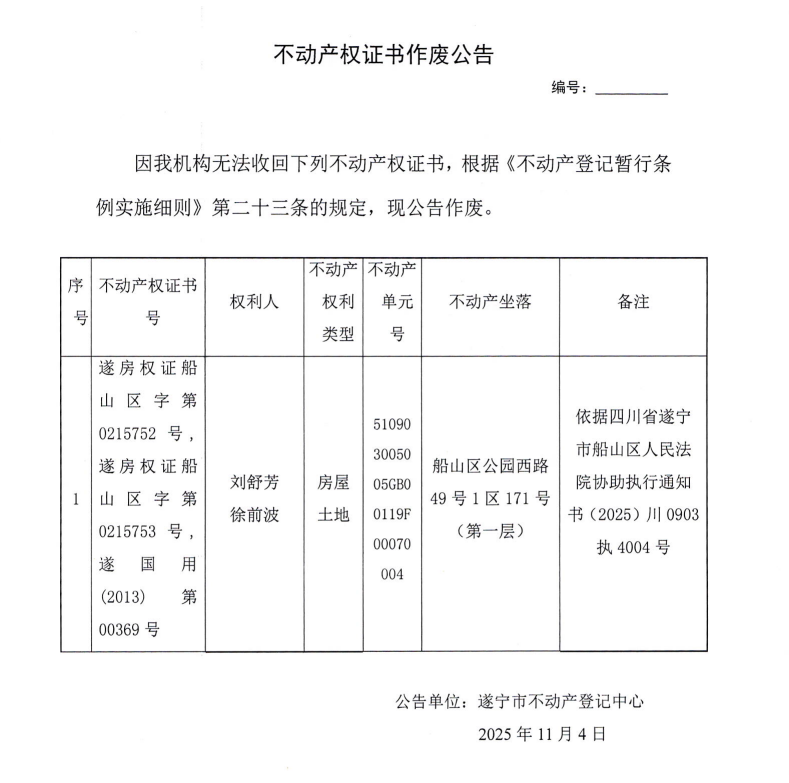 不动产权证书作废公告(刘舒芳、徐前波)