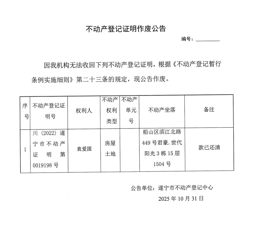 不动产登记证明作废公告(袁爱国)