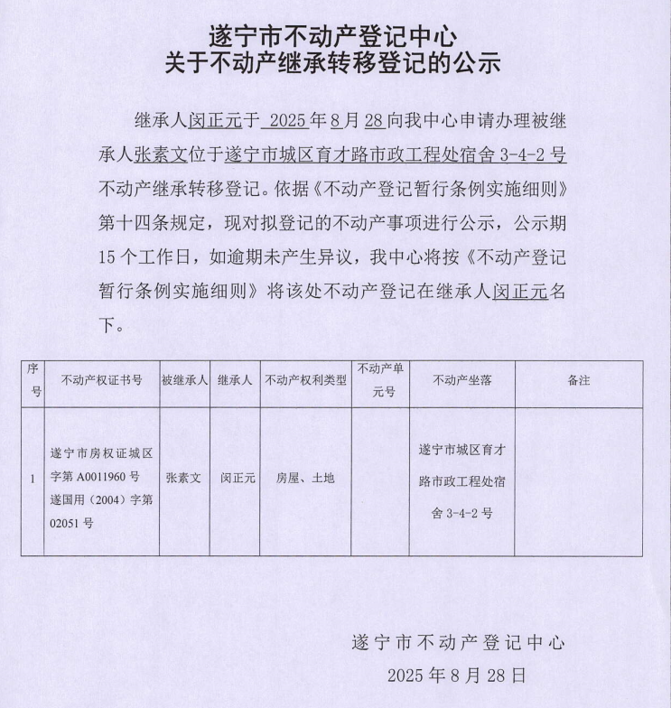 遂宁市不动产登记中心关于不动产继承转移登记的公示(闵正元)