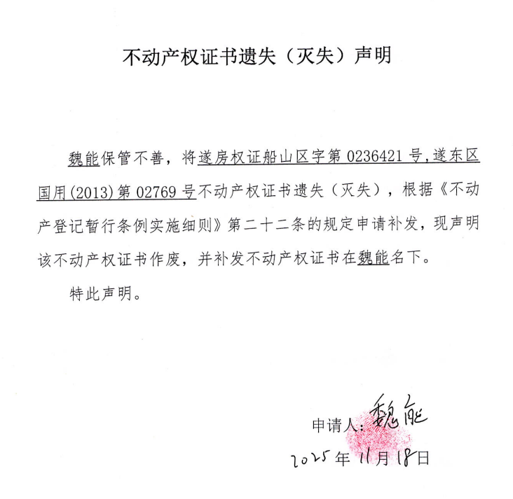 不动产权证书遗失(灭失)声明(魏能)