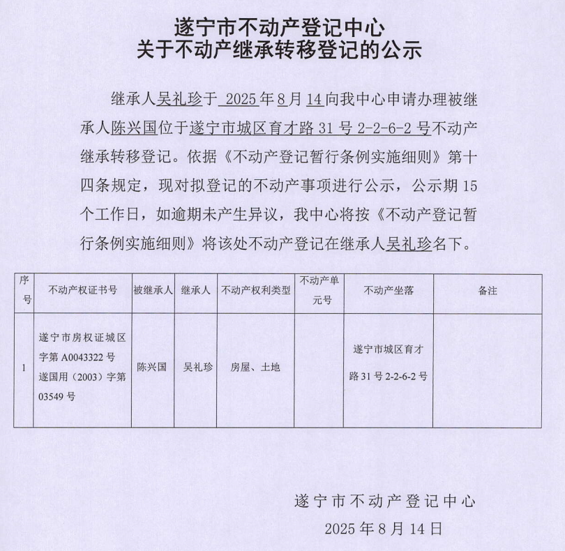 遂宁市不动产登记中心关于不动产继承转移登记的公示(吴礼珍)