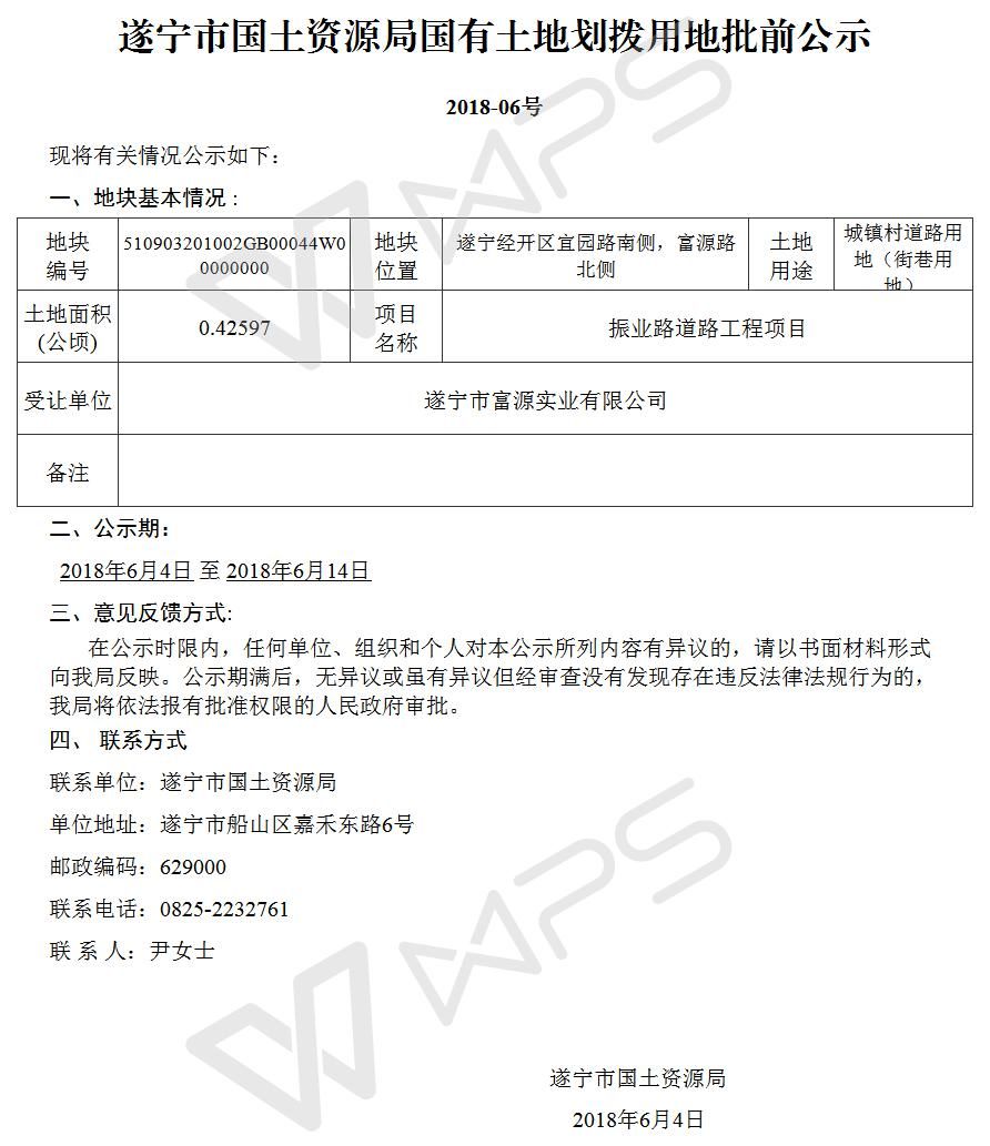 遂宁市国土资源局国有土地划拨用地批前公示(2018-06号)