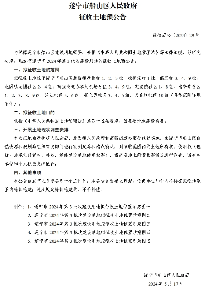 遂宁市船山区人民政府征收土地预公告(遂船府公〔2024〕29号)