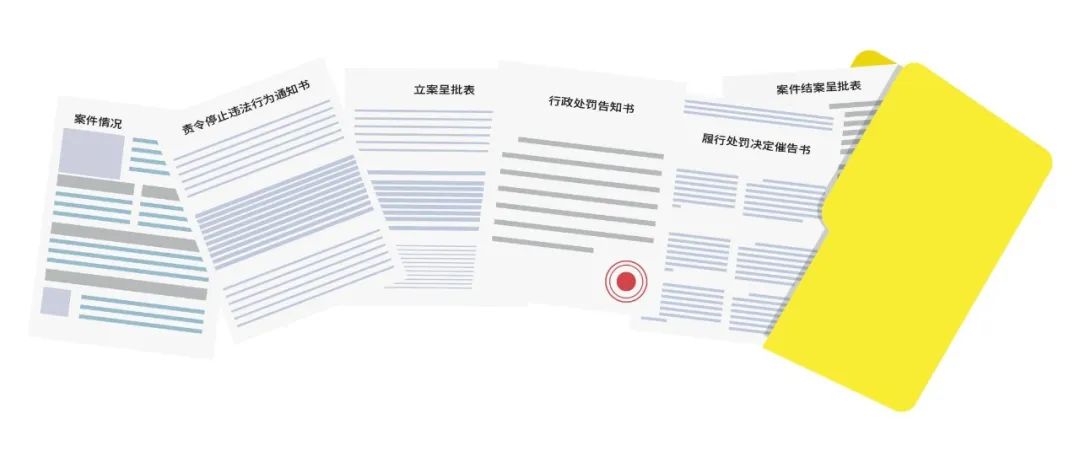 归档材料:卷宗内的归档材料应当包括:(1)封面、目录;(2)案件来源材料;(3)责令停止违法行为通知书、责令改正违法行为通知书;(4)立案(不予立案)呈批表;(5)证据材料;(6)调查报告;(7)审理记录;(8)重大执法决定法制审核意见;(9)案件处理决定呈批表;(10)行政处罚告知书;(11)当事人陈述申辩材料、复核意见书;(12)行政处罚听证告知书、听证通知书、听证笔录等;(13)行政处罚决定书或者行政处理决定;(14)党纪政务处分决定、问题线索移送书、刑事判决书、涉嫌犯罪案件移送书、案件管辖移送书;(15)履行处罚决定催告书;(16)强制执行申请书、申请送达情况记录;(17)行政处罚决定执行记录、罚没收据、缴纳相关费用收据、暂缓或者分期缴纳罚款的审批材料、吊销许可证件公告、非法财物移交书、非法财物清单、撤销批准文件的决定及相关材料;(18)经行政复议机关复议的应当附具行政复议决定书、经人民法院审理的应当附具人民法院裁判文书副本;(19)案件结案呈批表;(20)有关法律文书送达回证;(21)其他需要归档的材料。