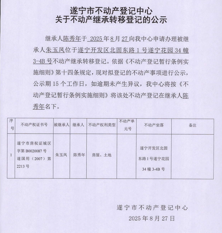遂宁市不动产登记中心关于不动产继承转移登记的公示(陈秀年)