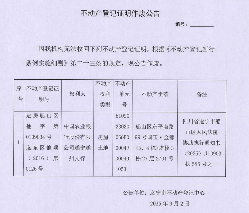不动产登记证明作废公告(中国农业银行股份有限公司遂宁遂州支行)