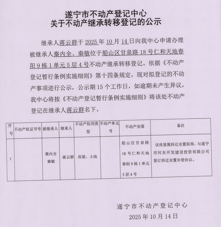 遂宁市不动产登记中心关于不动产继承转移登记的公示(蒋云群)