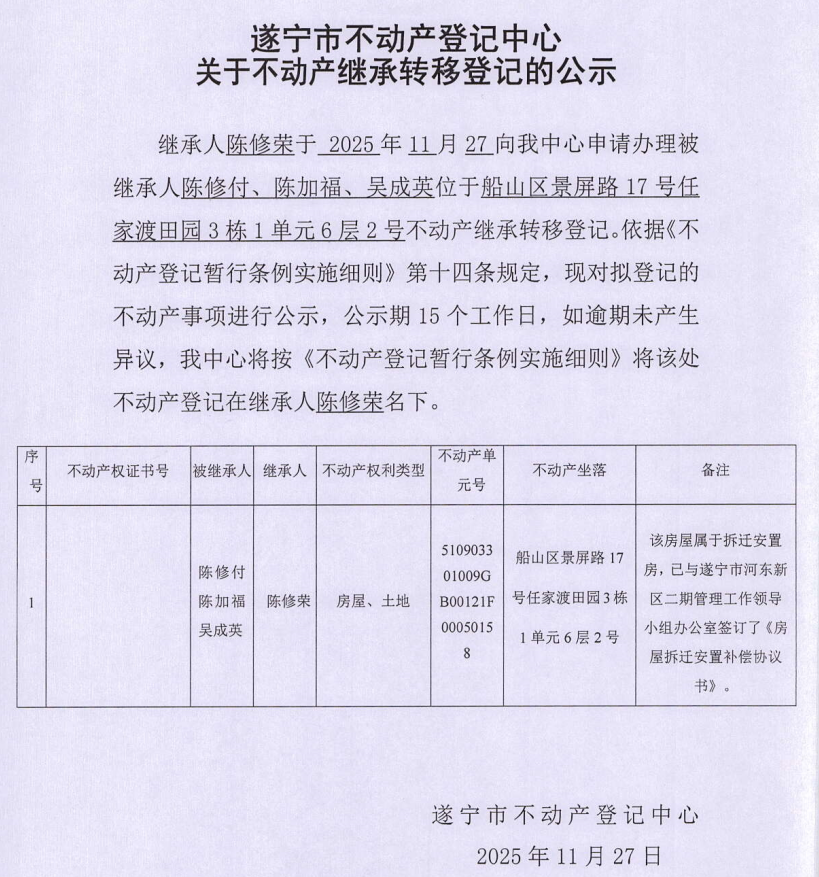 遂宁市不动产登记中心关于不动产继承转移登记的公示(陈修荣)