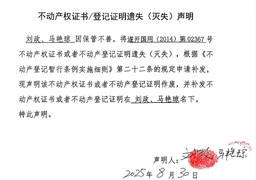 不动产权证书/登记证明遗失(灭失)声明(刘政、马艳琼)