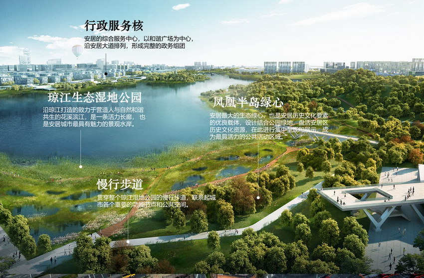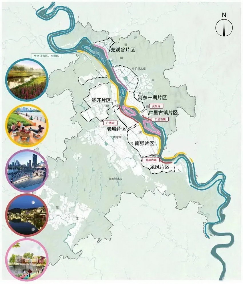 通过打造好五类主题岸线,维护好遂宁水网纵横,湿地密布,四岛连心的水系格局。塑造体现遂宁都市魅力的涪江岸线新场景。