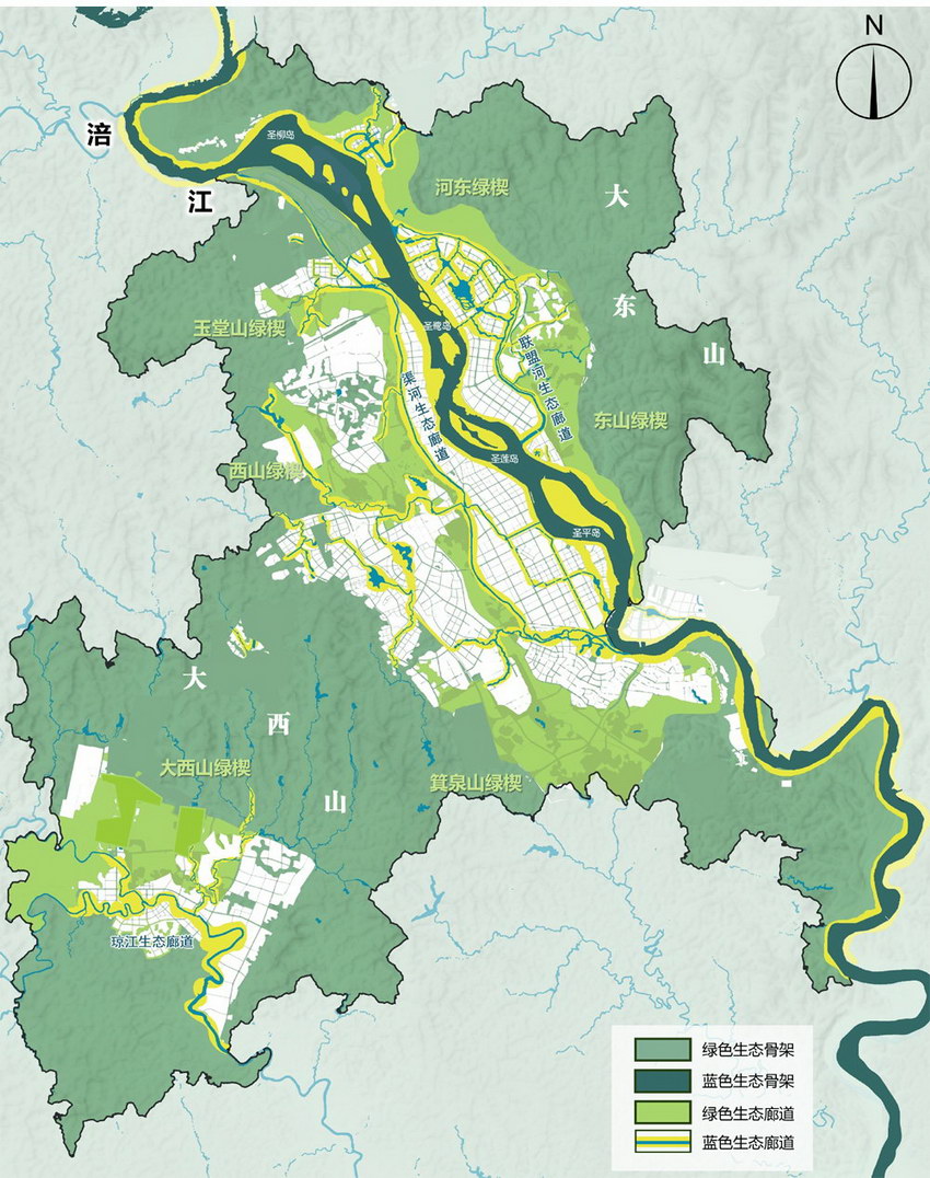 3大蓝绿生态骨架,蓝色生态骨架为涪江(含四岛)绿色生态骨架为大东山、大西山。6条山体绿楔,含玉堂山绿楔、西山绿楔、箕泉山绿楔、大西山绿楔、河东绿楔、东山绿楔。3条水系廊道,渠河生态廊道、联盟河生态廊道、琼江生态廊道。
