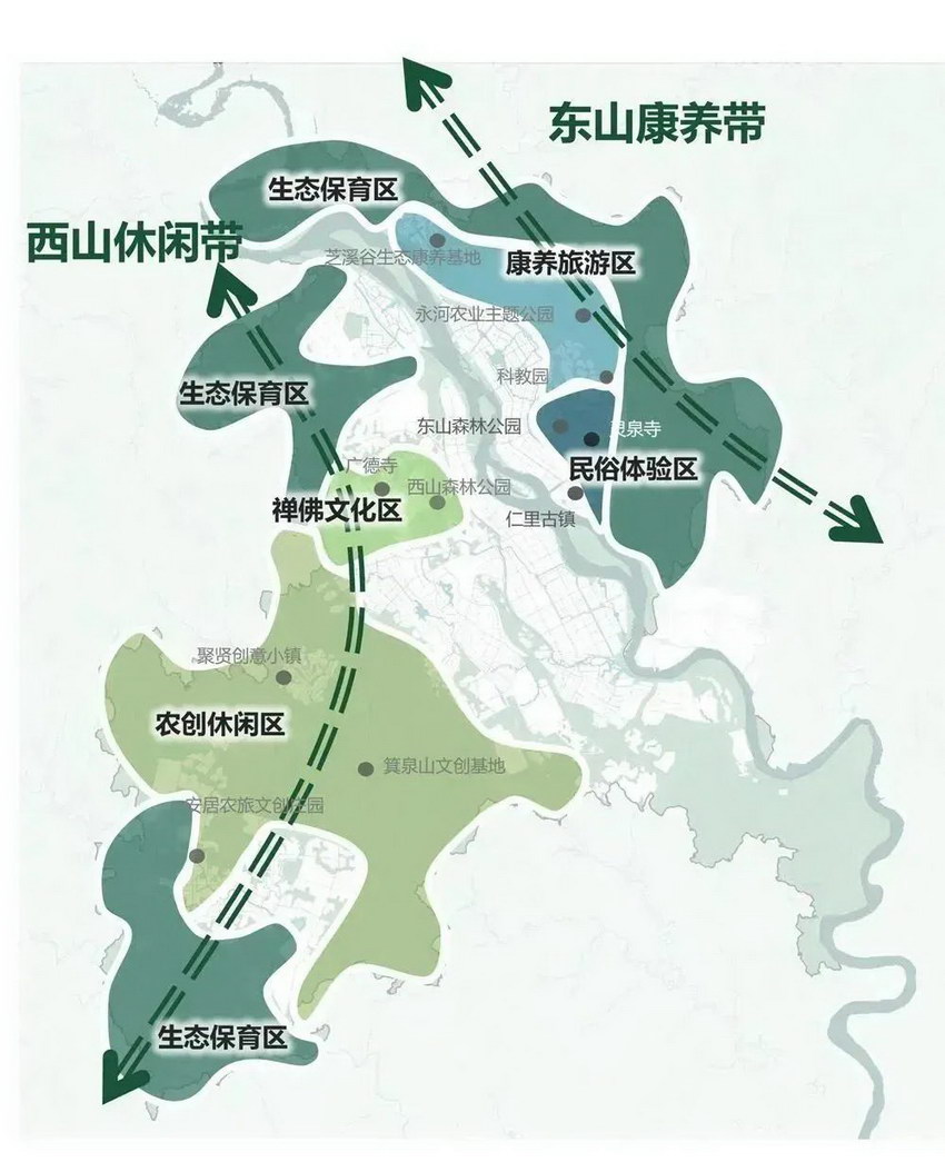 以东山、西山构成城市核心生态本底与背景。大西山发展生态保育、祈福文化、农创旅游,打造以“广德寺景区”为龙头的西山文化旅游带。重点发展公园绿地、风景名胜区、湿地公园、森林公园和郊区公园的配套旅游接待,建好服务设施,打造休闲疗养、生态旅游项目,建全文化娱乐设施。限制各类用地调整为大型商业办公项目,限制工业与物流用地;限制各类用地调整为住宅商品房。