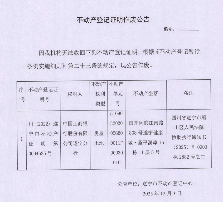 不动产登记证明作废公告(中国工商银行股份有限公司遂宁分行)