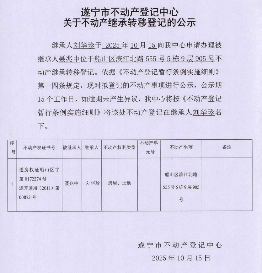 遂宁市不动产登记中心关于不动产继承转移登记的公示(刘华珍)