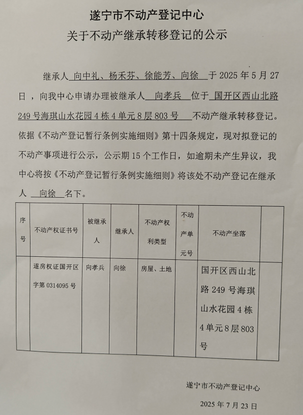 遂宁市不动产登记中心关于不动产继承转移登记的公示(向徐)