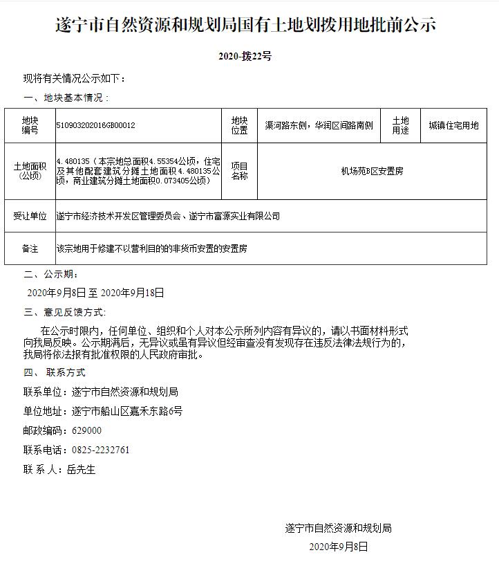 遂宁市自然资源和规划局国有土地划拨用地批前公示(2020-拨22号)