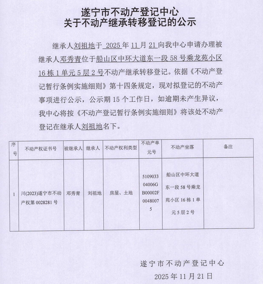 遂宁市不动产登记中心关于不动产继承转移登记的公示(刘祖地)