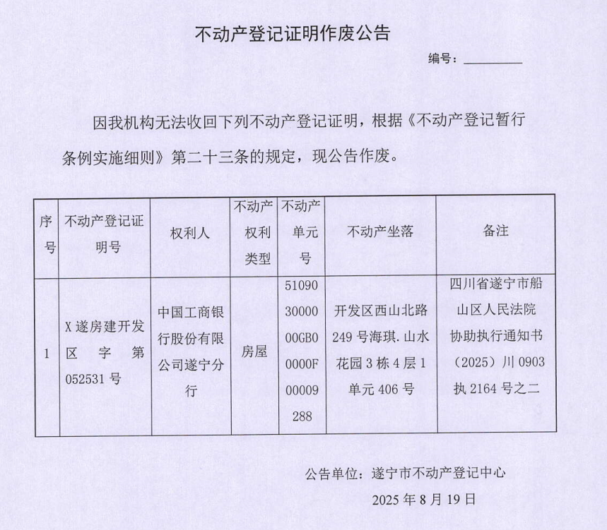 不动产登记证明作废公告(中国工商银行股份有限公司遂宁分行)