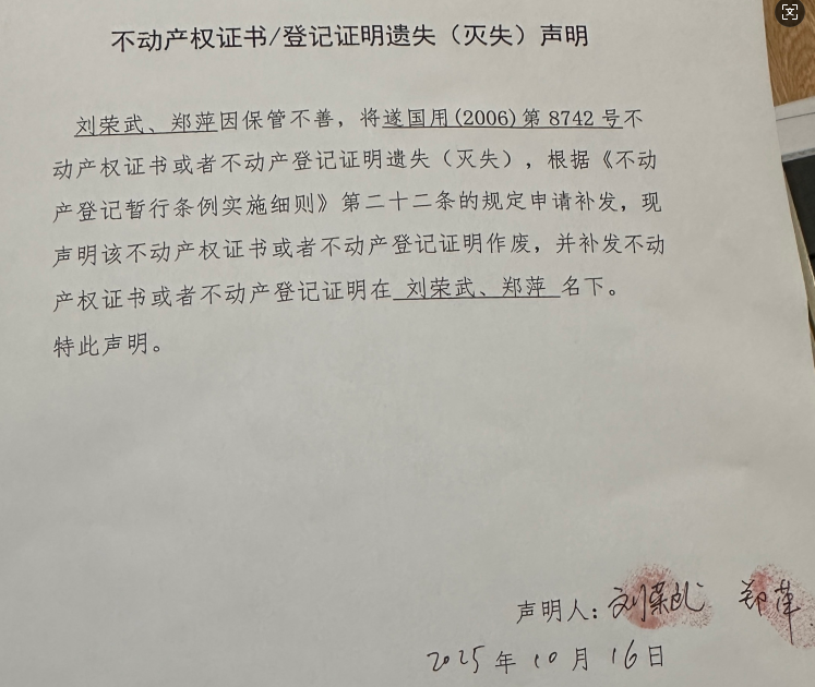 不动产权证书/登记证明遗失(灭失)声明(刘荣武、郑萍)