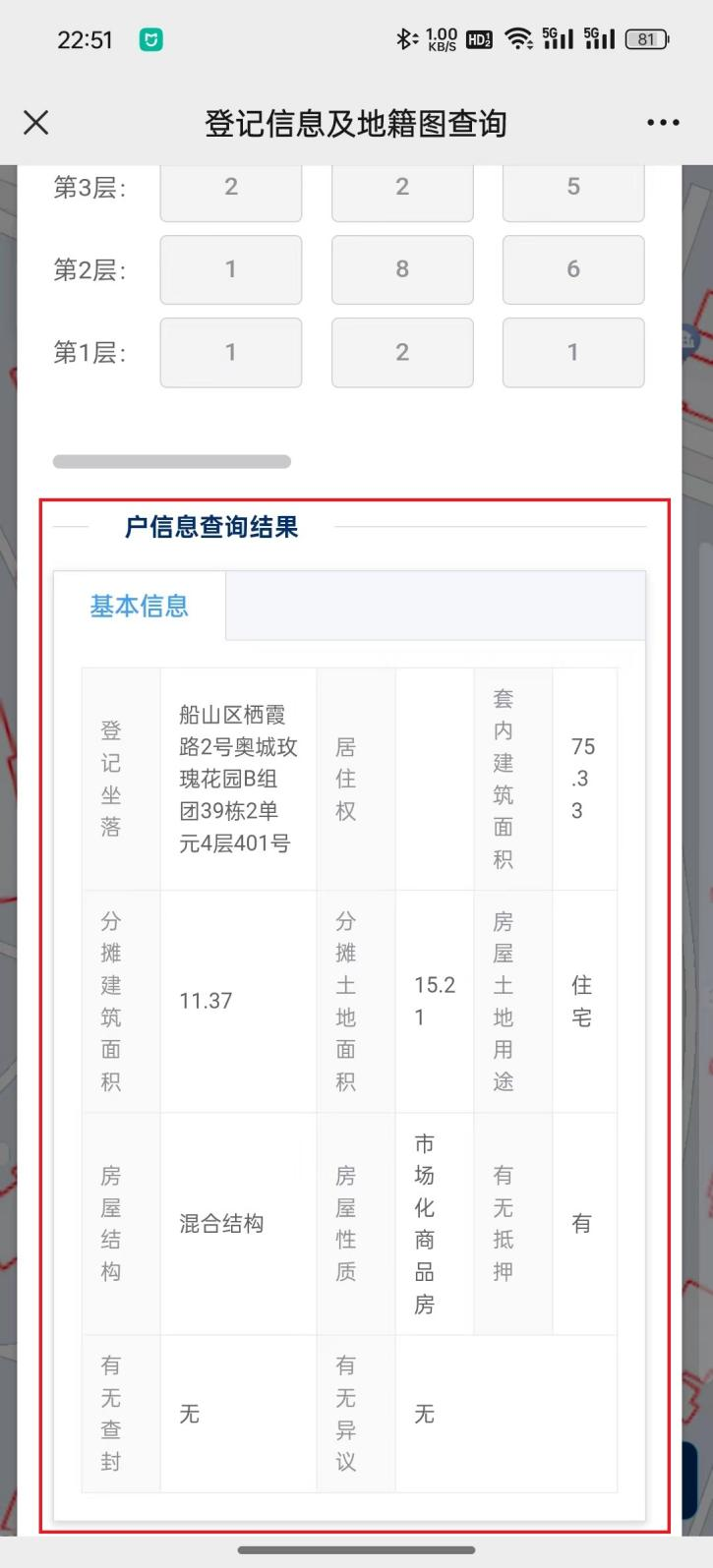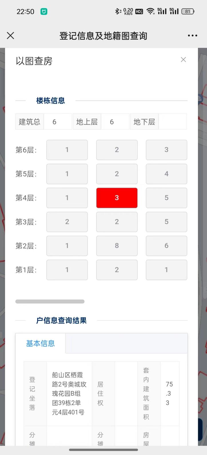 3.滑动浏览所在楼栋单元情况,点击相应层号、房号进行不动产登记信息精准定位查询,即可获取该房屋不动产坐落、面积、用途等自然状况和查封、抵押、居住权等权利限制性情况。