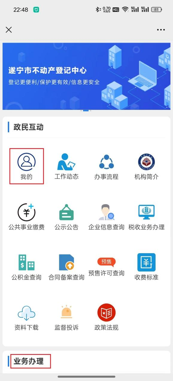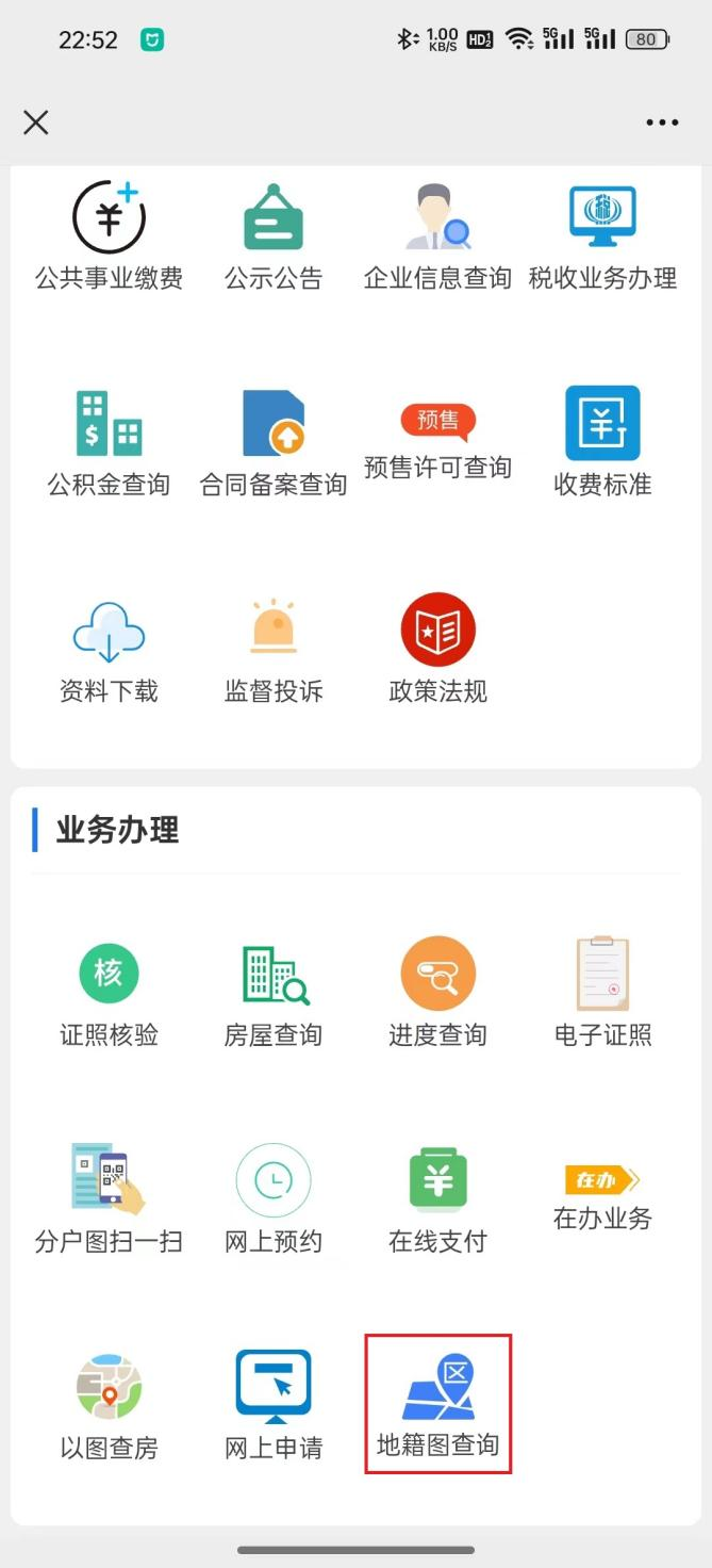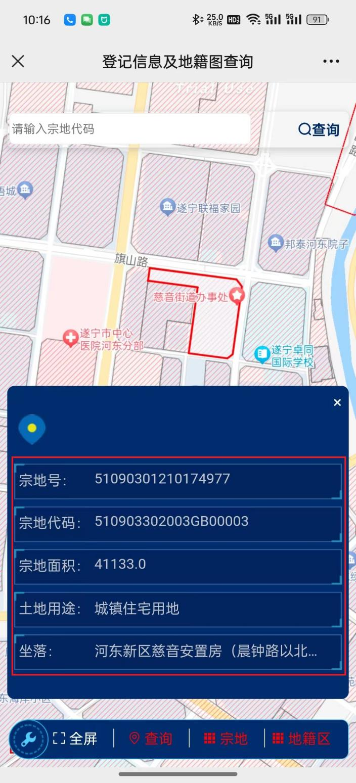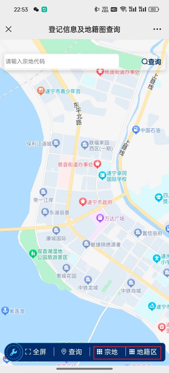 1.点击遂e登微信公众号“地籍图查询”服务,点击“地籍区”“宗地”打开楼栋图层;