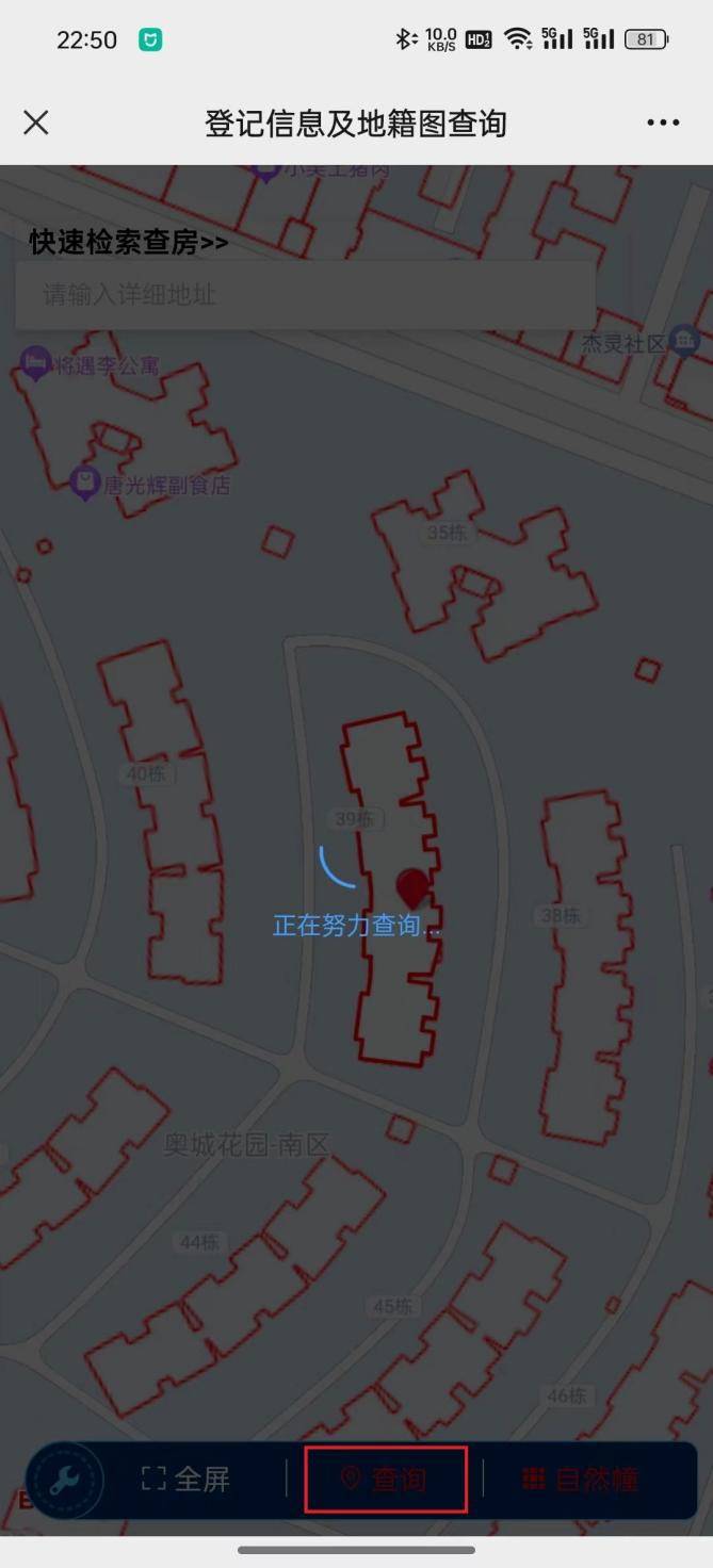 2.通过缩放和拖动找到拟查询的不动产位置,点击空间位置,或输入不动产具体坐落信息检索,打开“查询”按钮后点击对应楼栋图形;