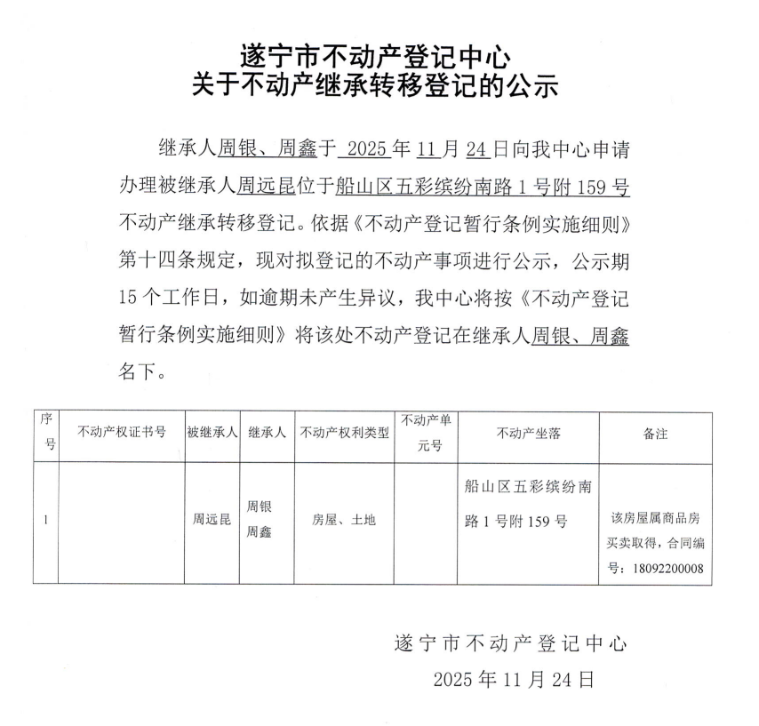 遂宁市不动产登记中心关于不动产继承转移登记的公示(周银、周鑫)