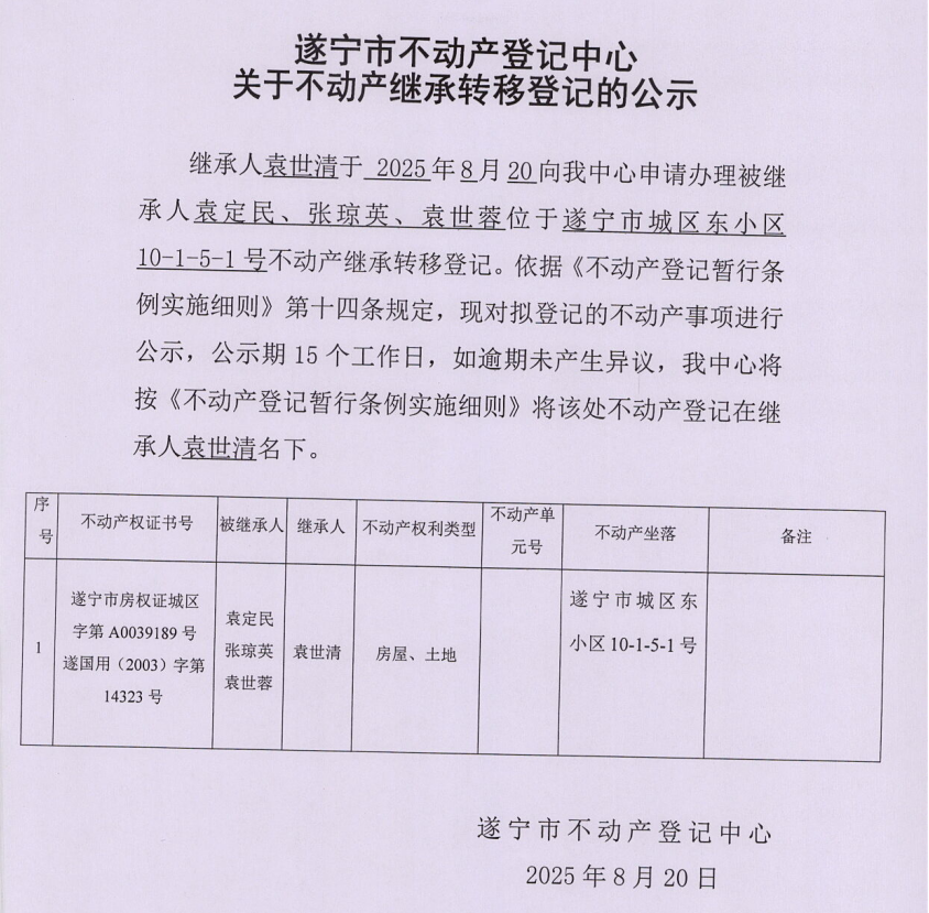 遂宁市不动产登记中心关于不动产继承转移登记的公示(袁世清)