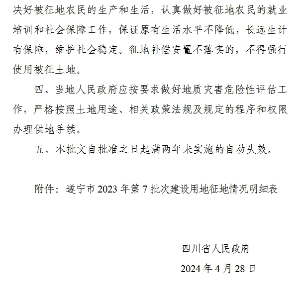 四川省人民政府关于遂宁市2023年第7批次建设用地的批复(川府土〔2024〕562号)