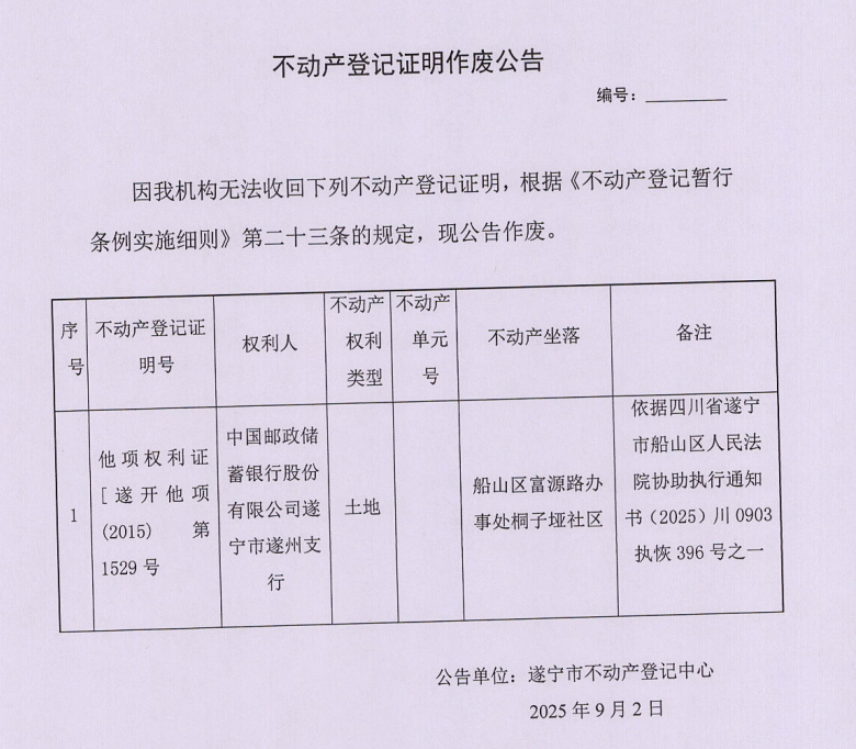 不动产登记证明作废公告(中国邮政储蓄银行股份有限公司遂宁市遂州支行)