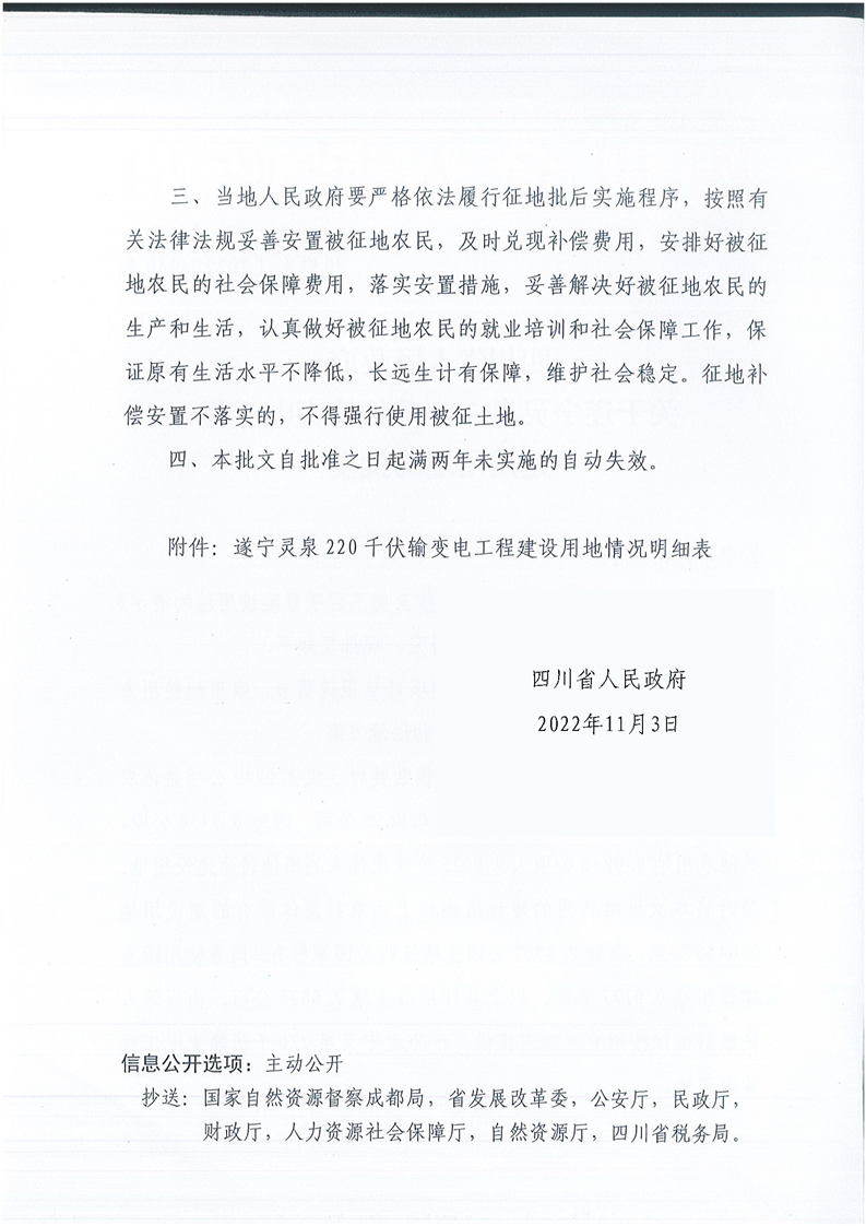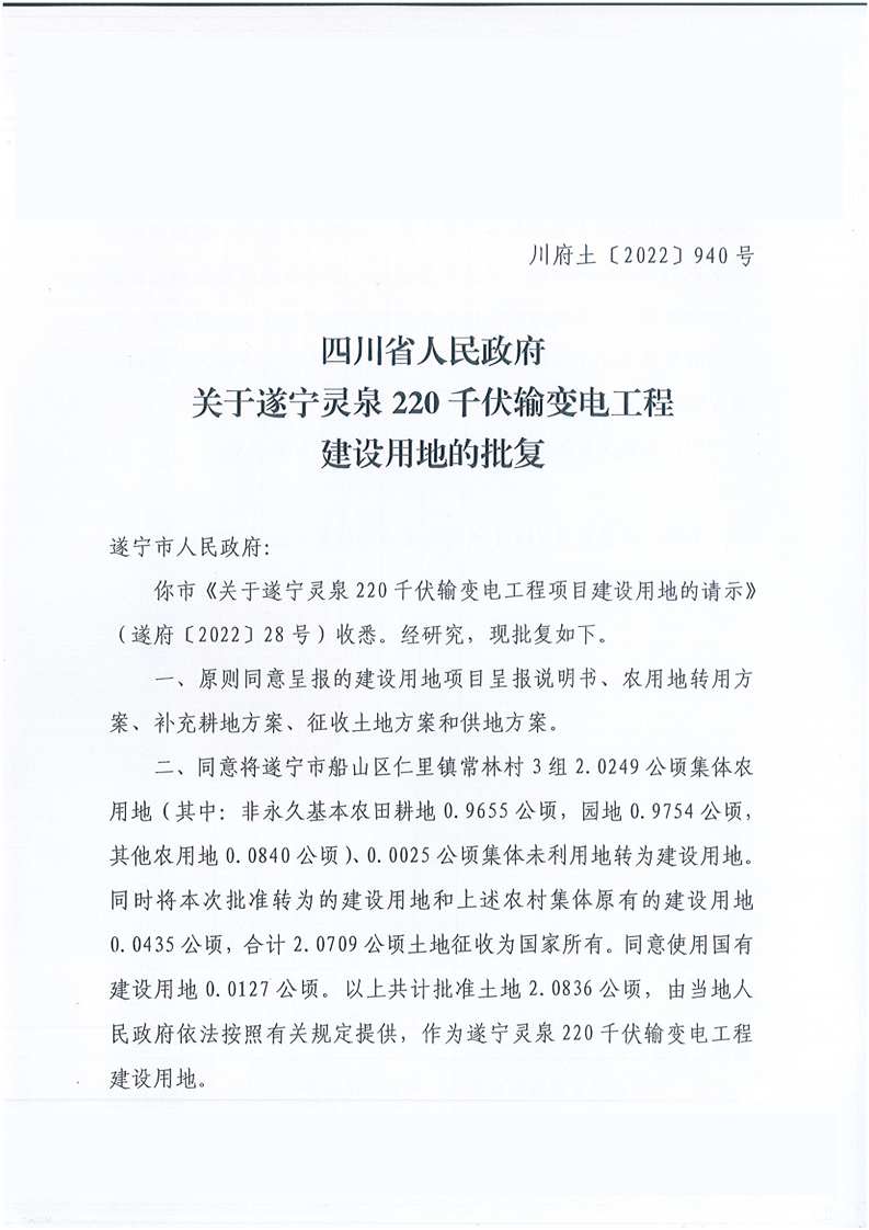 四川省人民政府关于遂宁灵泉220千伏输变电工程建设用地的批复(川府土〔2022〕940号)