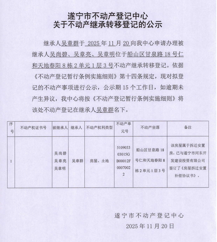 遂宁市不动产登记中心关于不动产继承转移登记的公示(吴章群)