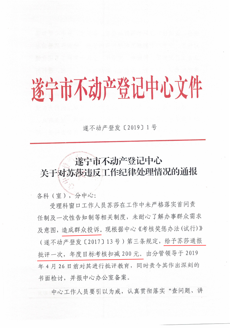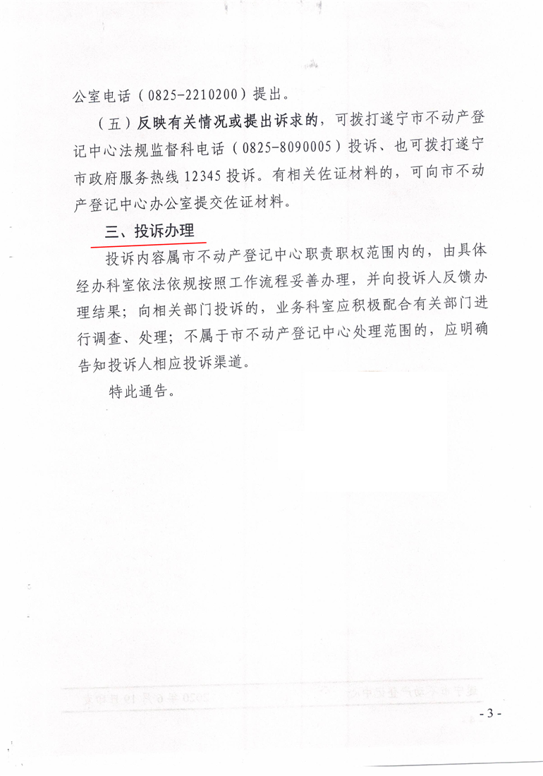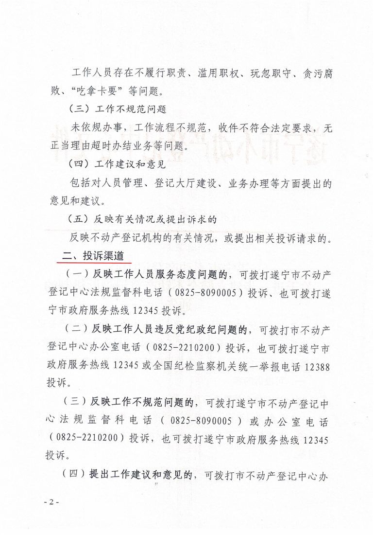 投诉路径:进入“遂宁市不动产登记中心”微信公众号,点击“工作”菜单 ,选择“投诉留言”,可选择在线留言或拨打电话进行投诉
